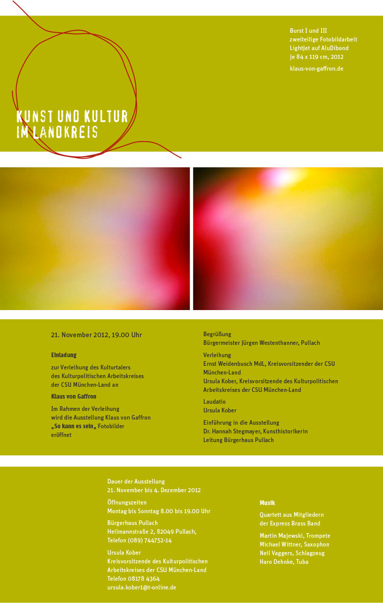 Verleihung des Kulturtalers an Klaus von Gaffron am 21. November 2012 im Rahmen der Verleihung wird die Ausstellung Klaus von Gaffron „So kann es sein“ - Fotobilder