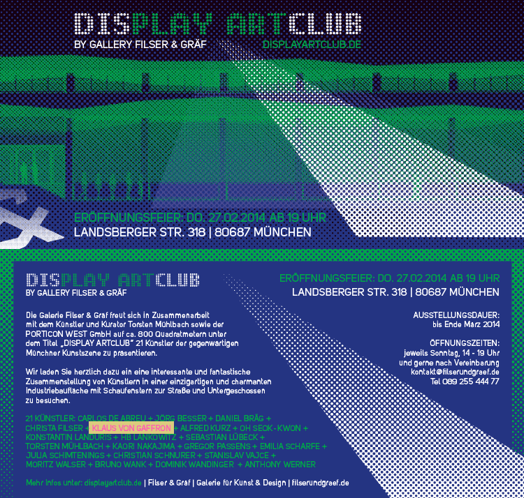 Die Galerie Filser & Gräf freut sich in Zusammenarbeit mit dem Künstler und Kurator Torsten Mühlbach sowie der PORTICON WEST GmbH auf ca. 800 Quadratmetern unter dem Titel „DISPLAY ARTCLUB“ 21 Künstler der gegenwärtigen Münchner Kunstszene zu präsentieren.