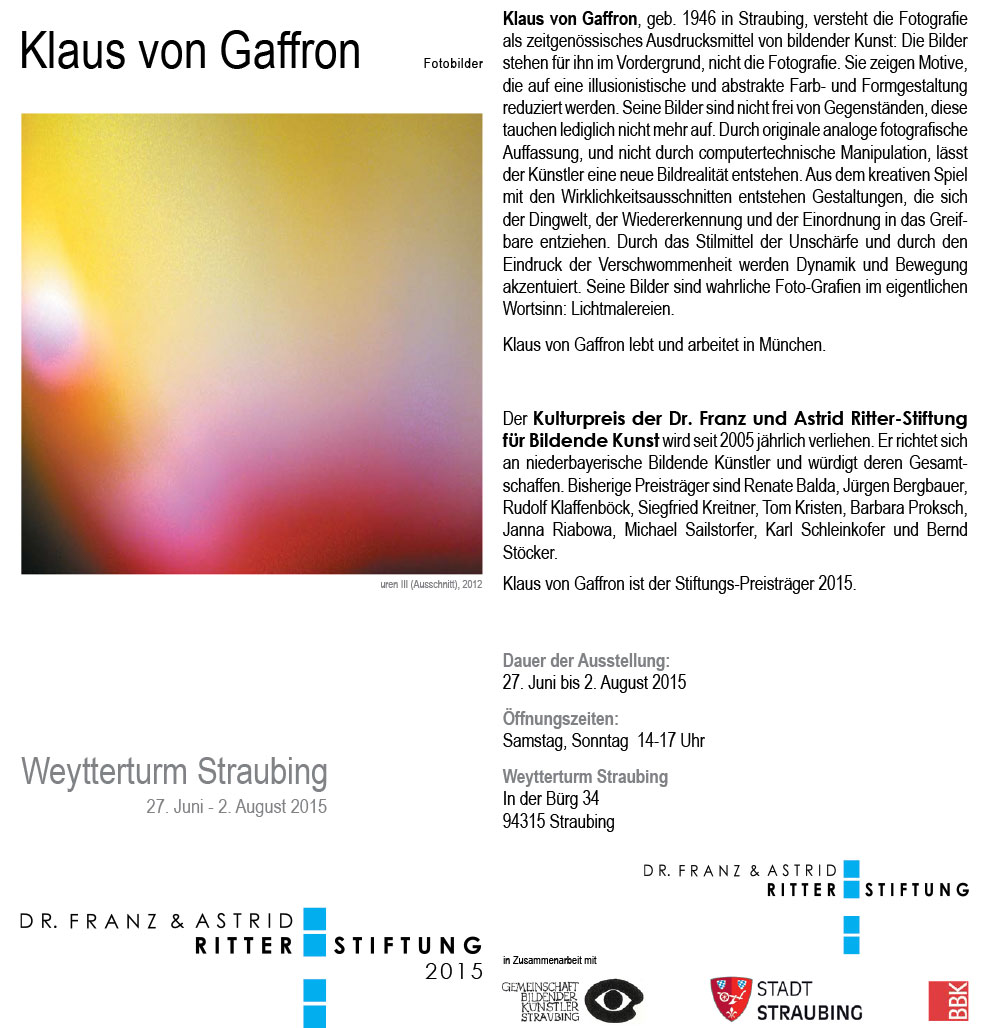 Gaffrons Fotobildarbeiten sind im Reich der Abstraktion angesiedelt. Sie versetzen feste Kategorien in Bewegung. Formassoziationen, Licht- und Farbräume von unauslotbarer Dimensionierung tun sich auf, serielle Reihungen faszinieren und irritieren mit ihren Symmetrien, Brüchen und Permutationen.